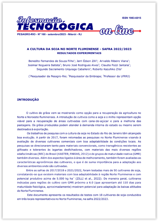 Publicações ADERÊNCIA A NORMALIDADE E DECOMPOSIÇÃO DE EFEITOS EM BIOMETRIA DIGITAL DE PLÂNTULAS DE GERGELIM 12 de novembro de 2025 Programa de Educação Ambiental do Sistema Campo Limpo no estado do Rio de Janeiro – no desafio da ecoeficiência 28 de agosto de 2025 CARACTERIZAÇÃO DA OLERICULTURA ORGÂNICA EM POSSE, DISTRITO DE PETRÓPOLIS – RJ, BRASIL 26 de maio de 2025 Impact of a long term sugarcane harvesting system on crop performance micronutrient availability and soil organic carbon in tableland soils of Linhares ES Brazil 21 de maio de 2025 A CULTURA DA SOJA NO NORTE FLUMINENSE – SAFRA 2022/2023 RESULTADOS EXPERIMENTAIS 1 de setembro de 2023 MODELOS MISTOS E GGE BIPLOT NA SELEÇÃO DE GENÓTIPOS DE SOJA PARA REGIÃO NORTE FLUMINENSE 21 de novembro de 2022 AVALIAÇÃO DE CULTIVOS DE SOJA NO NORTE FLUMINENSE 10 de outubro de 2022 A PRODUÇÃO DA SOJA E DO MILHO COMO UM CAMINHO PARA O DESENVOLVIMENTO DO AGRONEGÓCIO DA REGIÃO NORTE FLUMINENSE 21 de abril de 2021 CARACTERÍSTICAS SOCIOECONÔMICAS, EDÁFICAS E PRODUTIVAS DAS ÁREAS CULTIVADAS COM CANA-DE-AÇÚCAR (Saccharum sp.) EM PARATY 26 de abril de 2013